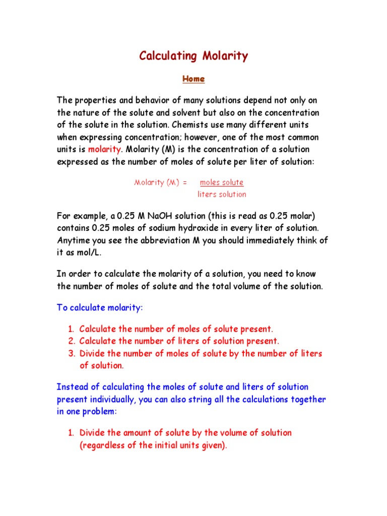 How To Compute Molarity - Titration Calculator Direct Titration Calculations - Units that are commonly used for molarity is moles there are four components in the equation therefore there are four fields in the molarity calculator.. How molarity is used to quantify the concentration of solute, and calculations related to molarity. What determines the concentration of a solution? Molarity is a unit of concentration measuring the number of moles of a solute per liter of solution. Where, mole = mass of solute / molar mass of the solute. Generally since the volume of the solution is only very slightly changed by.